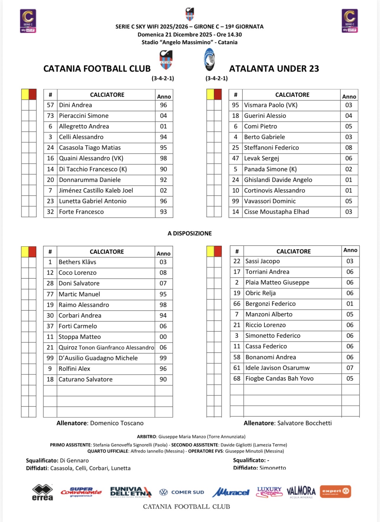 CATANIA (3-4-2-1): Dini; Pieraccini, Allegretto, Celli; Casasola, Quaini, Di Tacchio, Donnarumma; Jimenez, Lunetta; Forte. In panchina: Bethers, Coco, Doni, Martic, Doni, Corbari, Forti, Quiroz, Stoppa, D'Ausilio, Rolfini, Caturano. All.: Toscano