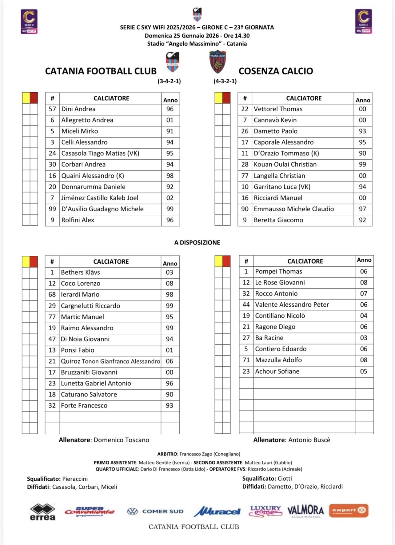 CATANIA (3-4-2-1): Dini; Allegretto, Miceli, Celli; Casasola, Quaini, Corbari, Donnarumma; Jimenez, D'Ausilio; Rolfini. In panchina: Bethers, Coco, Ierardi, Cargnelutti, Martic, Raimo, Ponsi, Di Noia, Quiroz, Lunetta, Bruzzaniti, Forte, Caturano. All.: Toscano.