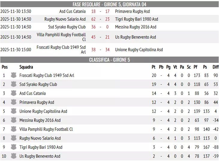 Il CUS Catania porta così a casa quattro punti fondamentali, frutto di una prova compatta e della capacità di reagire con lucidità alle difficoltà iniziali. Ora lo sguardo è già rivolto al prossimo impegno di campionato: un passo alla volta, tutti insieme. Il successo consente al CUS Catania di coach Luca Mammana di scavalcare in classifica proprio i gialloblu romani. Gli etnei torneranno in campo il 7 dicembre alle ore 14:30 contro il Rugby Benevento, ultima in classifica.